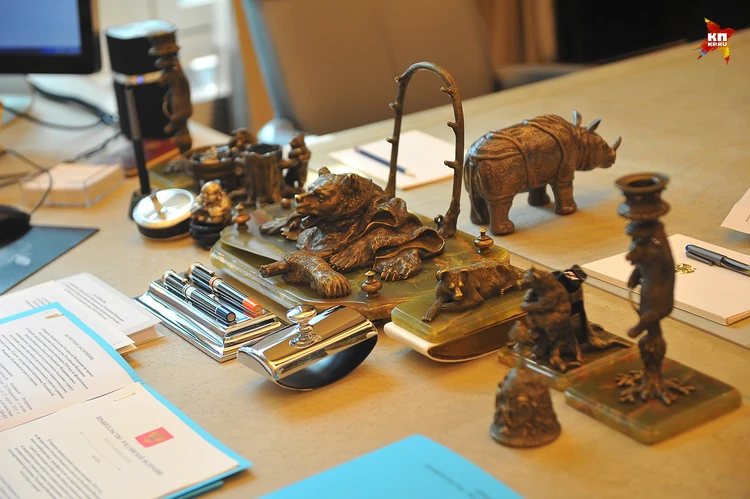 我们从工作区进入休息室,涅韦罗夫在那里存放着收到的纪念品(主要是熊——”统一俄罗斯”党的象征)、个人物品和照片。